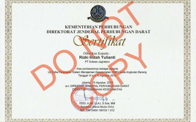 Sertifikat Pelatihan Uji SMK pada angkutan barang |